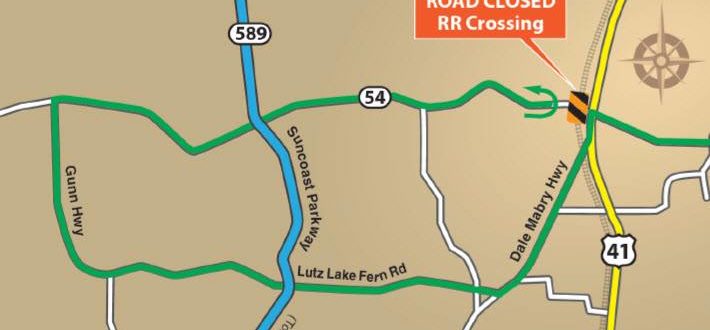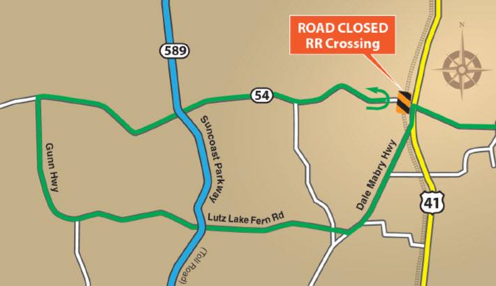 Quick update to remind everyone that SR54 at Highway 41 will be completely closed to make updates to the railroad tracks. The closure will start July 23, 2016 around 10pm and last through July 25. The detour route is going to be down Gunn Highway and across. See the graphic provided by the FDOT.